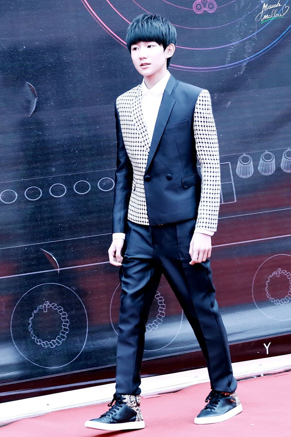 在活动照中出现的王源秉承了一贯的小鲜肉形象,黑白纯色拼接千鸟格纹西装+黑色西装裤+休闲平底鞋。看上去阳光又帅气,在青春活泼中又有着几分男人味与时尚气息。