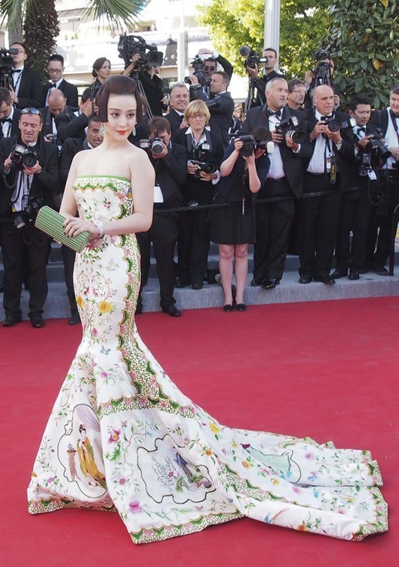 此次范冰冰是作为巴黎欧莱雅全球代言人中唯一一个来自亚洲区的代表,与伊娃·朗格利亚Eva Longoria、芙蕾达·平托Freida Pinto、简·芳达Jane Fonda等人组成明星梦之队出席开幕红毯,连续三年来受邀的她坦言很荣幸。当晚身着“china瓷”式礼服,以古典美人妆容、精致盘发搭配萧邦(Chopard)高级珠宝以及elie saab绿色手包的范冰冰一出现在毯,立刻引起了在场媒体的一阵骚动,现场观众们也是热情的欢迎这位戛纳熟客,高声呼喊“bing bing”。