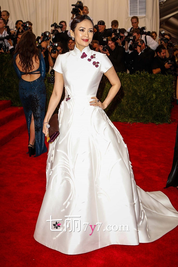 章子怡这身白色礼服可算是与中国风沾边的少数造型之一了,上身旗袍的设计很有中国风味,下身融入西方的礼服设计元素,很好的体现了中西方文化的融合。