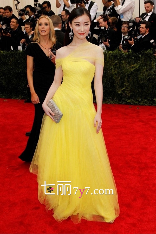 倪妮选择黄色礼服,因为黄色是最代表中国的色彩,不过纱裙的设计实在很难找到中国风的感觉。