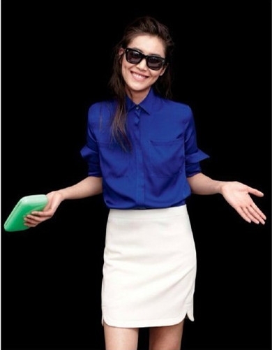 搭配看点:果然瘦穿什么都好看,气质的蓝色衬衫搭配白色包臀裙,干净清爽又很有知性和海洋气息,清凉夏日,职场lady这样穿也美美哒。