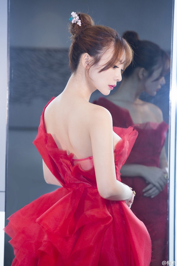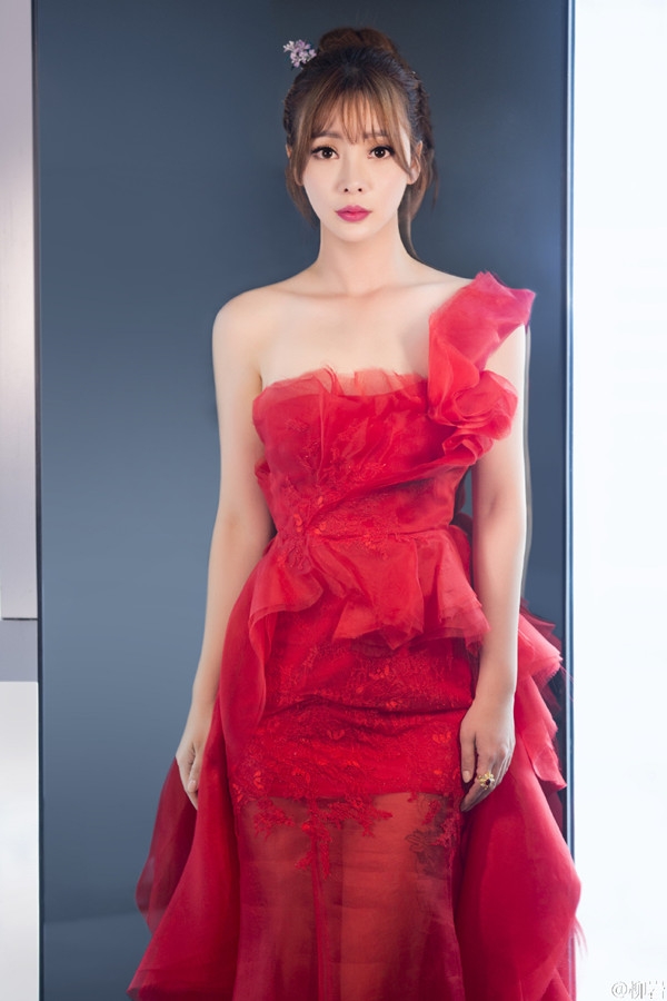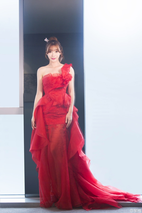 2015年6月16日,柳岩以一身美艳的红色礼服亮相《煎饼侠》在上海举行“魔音”主题曲发布会,这套礼服来自设计师兰玉之手,层层叠叠的红色薄纱精致细腻,鲜红的色彩将柳岩肌肤衬得更加娇嫩,摇曳的裙摆和透视的薄纱散发一丝性感骄奢气息。