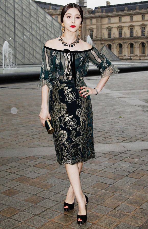 搭配看点:一袭半透的露肩薄纱上衣,搭配一条镶金暗纹的硬挺剪裁包臀中裙,仿佛罗浮宫油画里走出来的蒙娜丽莎一样,高雅端庄,气势逼人,搭配一双低调的黑色鱼嘴高跟鞋与一条造型款的黑色项链,与黑色的服装造型互相呼应,唯美又浪漫,让范爷气质尽显。