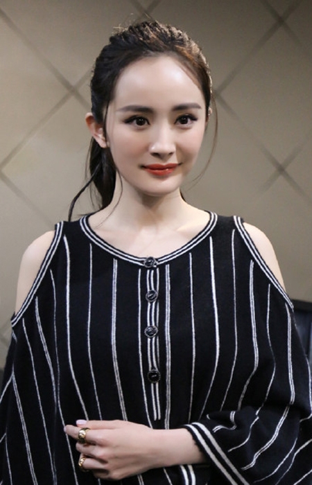 这是辣妈杨幂参加某珠宝展穿的一件竖条纹露肩膀纽扣上衣,设计感十足,小露的肩膀和锁骨显得很性感,搭配高高的马尾和红色的唇膏分别就是一位少女,完全没有妈妈范。