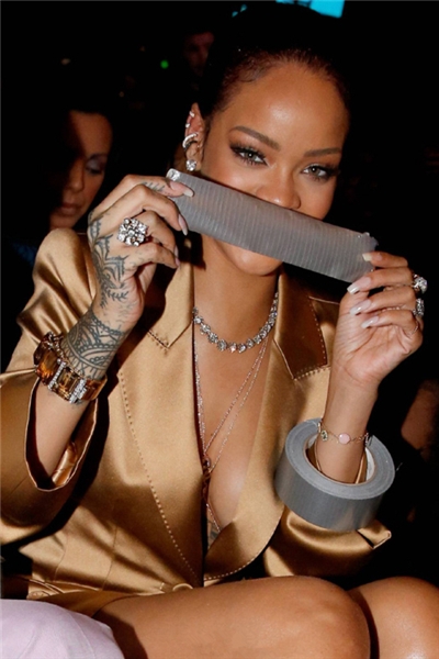 Rihannna在BET盛典抢尽风头,用胶带封领座嘴巴笑翻全场。出席造型火辣时尚。