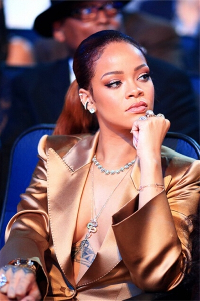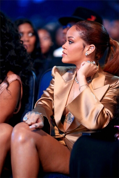 在BET颁奖晚会上Rihanna闪耀动人。此外大胆的深v香槟色西装套装穿着也是性感火辣引人注目。