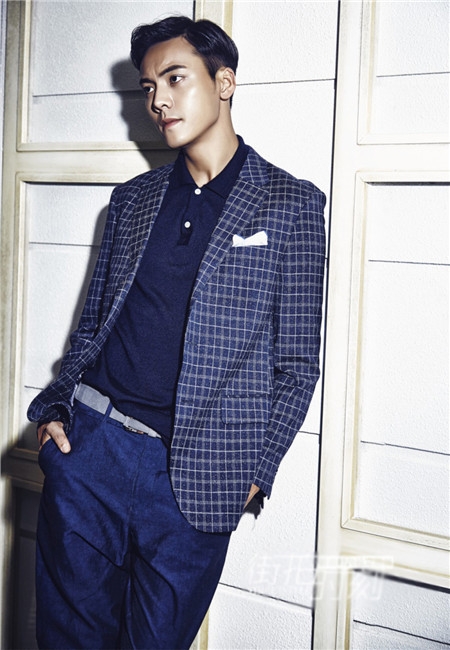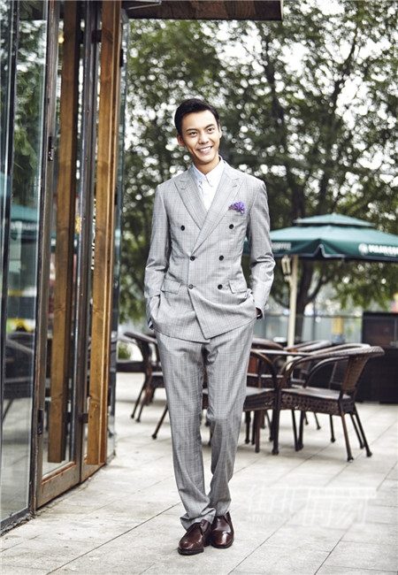 蓝白相间的格子西装,永不过时的格子搭配,深沉的蓝色搭配舒爽的白色,内搭蓝色翻领T恤白色的纽扣,浅蓝色的西装裤,毫无保留将男人的稳重成熟显现出来。