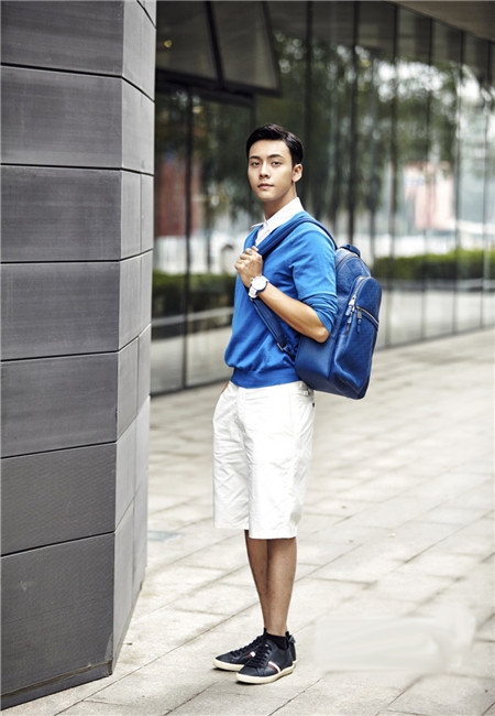 蓝色针织衫内搭白色衬衫鞋子选择运动板鞋,在裤子的搭配上选择白色运动短裤,当白色碰到蓝色和红色时,活力呼之欲出。