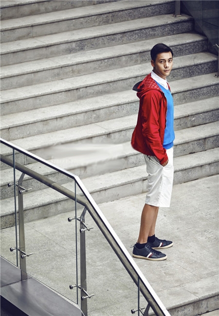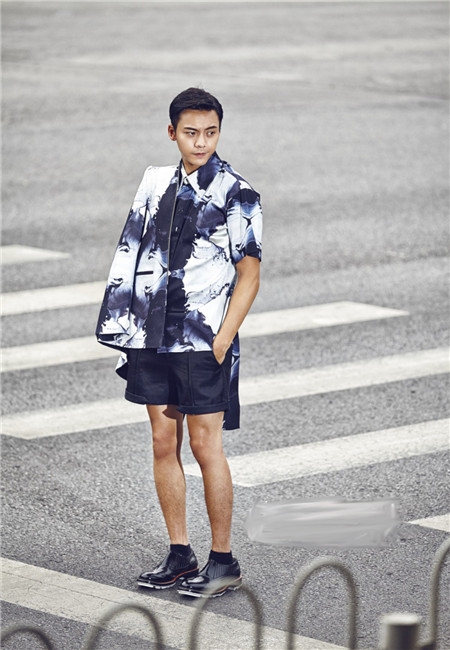 墨水丹晕染后的西装同过陈伟霆不羁的穿法演绎出少年得志的情怀,和普通西装搭配不同在裤子上选择的是同色系短裤,时尚感爆棚。