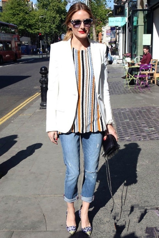 LOOK 6:白色休闲西装+拼色条纹上衣+七分破洞牛仔裤+尖头高跟鞋+链条包