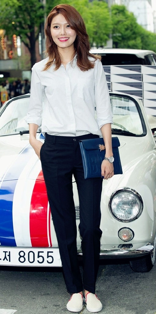 搭配看点:经典的黑白搭十分清爽,不过也很难穿出时尚气息,像崔秀英这样搭配与衬衫同色的鞋子可以让造型更加出众,因为统一的色系总能给人舒适的视觉美感,再搭配一款靛蓝色手拿包,轻松穿出轻熟女气质。将上衣扎进裤头,轻松提升腰线,打造长腿的即视感。
