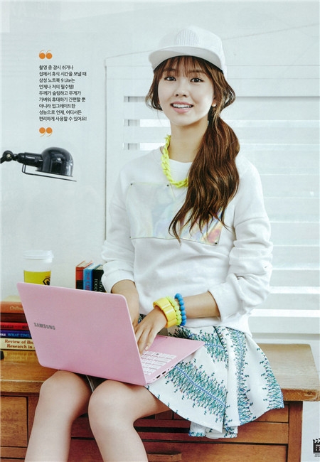 年轻的金所炫在服装颜色的选择上偏向于靓丽,颜色组合较多,鹅黄色的针织开衫和连衣裙颜色相近,棕色的书包和头发颜色相呼应,俏皮女郎的堆堆袜,时尚青春。
