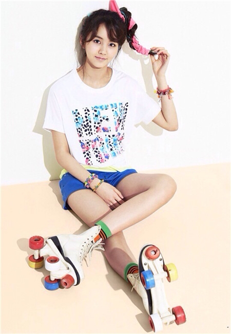 宽松T恤搭配亮眼的宝蓝色运动短裤,头发用粉红色的丝带编织,将头发扎起来,露出空气刘海,美少女!