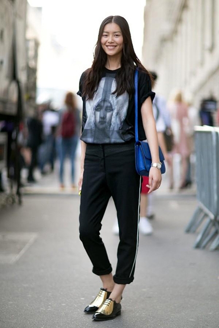 造型一:黑色人偶logoT恤+黑色裤子+金饰皮鞋+蓝色肩包