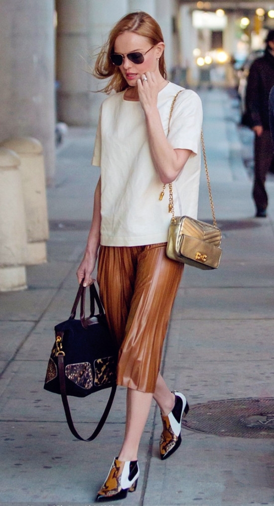 Style 5:白T+棕色百褶裙+蛇纹踝靴+手提包+链条包