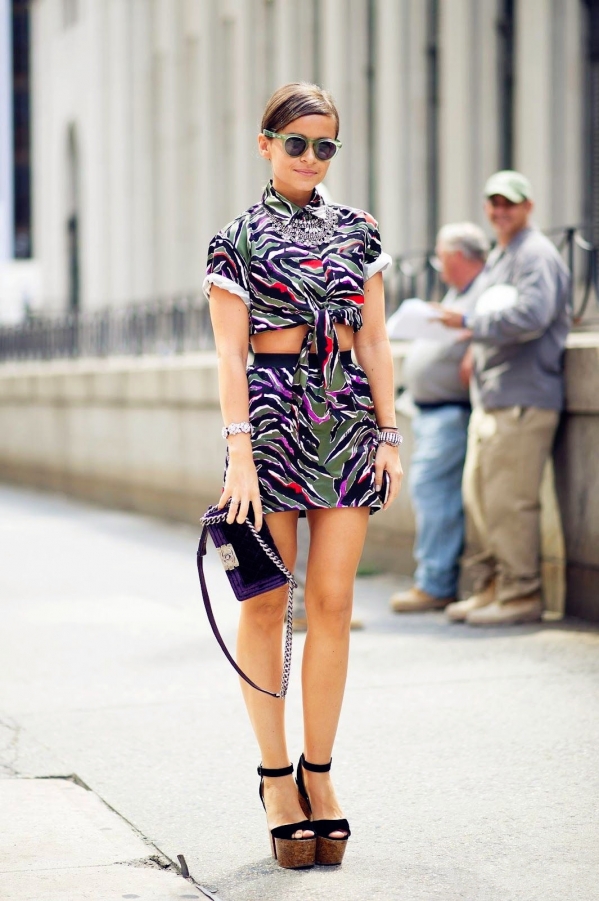 时尚看点:印花套装十分抢镜,依旧是短款上衣搭配高腰半身裙,而裙子的长度也是十分值得小个子女生借鉴的:大腿中部就是显高又性感的长度,再配上厚底高跟鞋,谁还看得出米洛斯拉瓦·杜玛(Miroslava Duma)只有155cm呢?