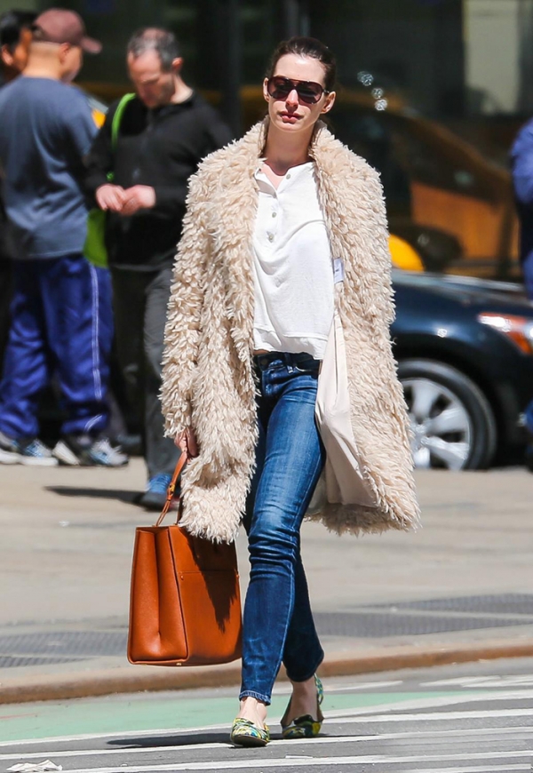 LOOK.2:毛绒大衣+白色棉麻+牛仔裤+拼色单鞋+棕色子母包