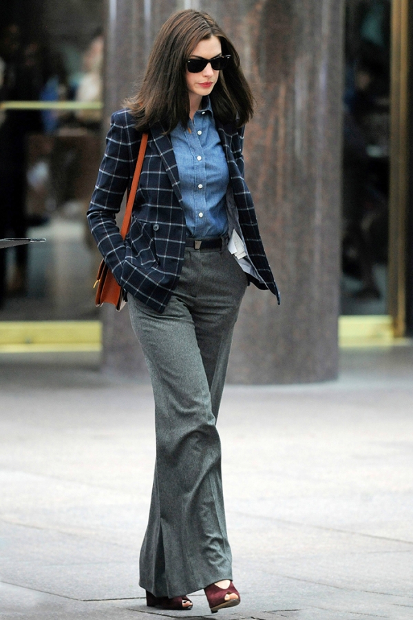 休闲的正装风格如何打造,安妮海瑟薇土中做了一个完美的诠释。正装不要局限自己的思维,选择一些不同的材质和款式能带来意想不到的效果。