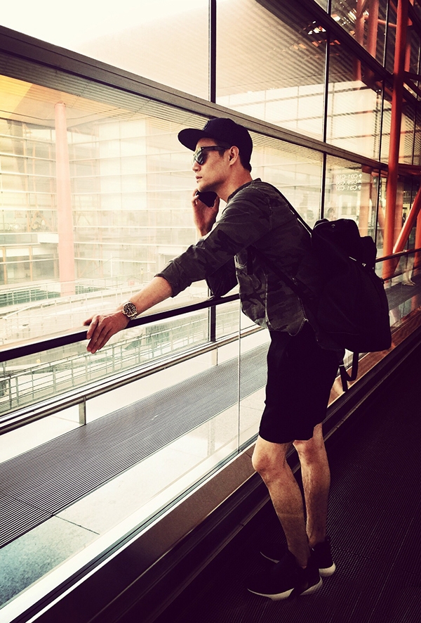 黑色长袖T+黑色五分裤+黑丝运动裤+黑色皮质双肩包+棒球帽