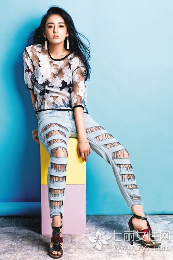 这组写真图片大胆应用了撞色,破洞,印花等时髦元素服装,进行个性组合,狂放不羁的服装在古力娜扎身上还穿出了性感美丽的味道。