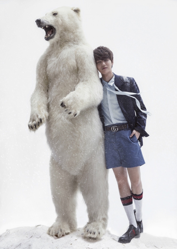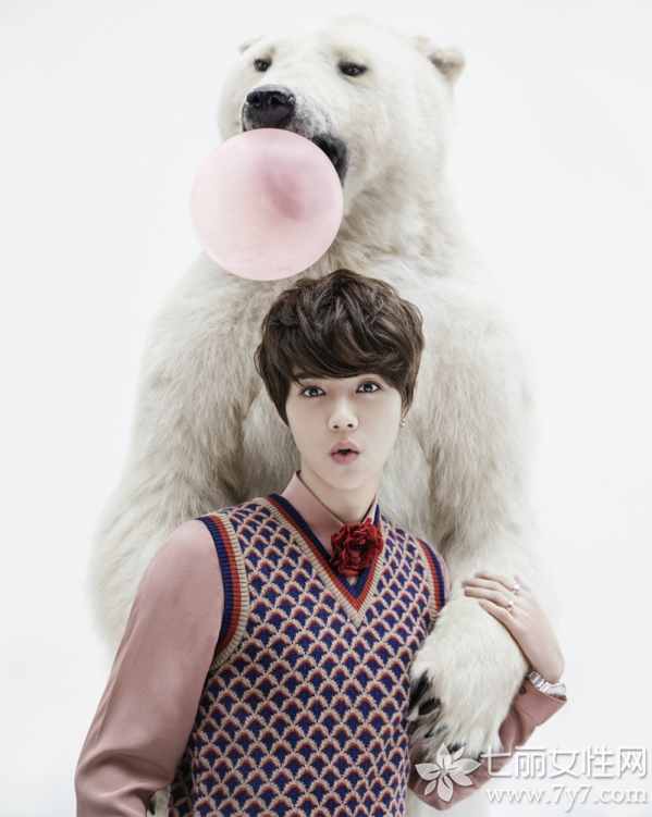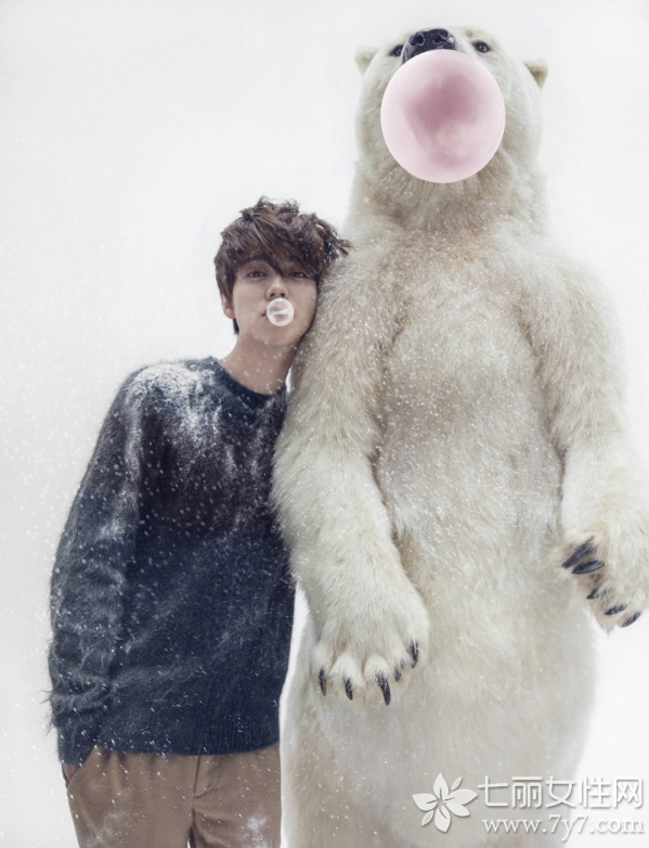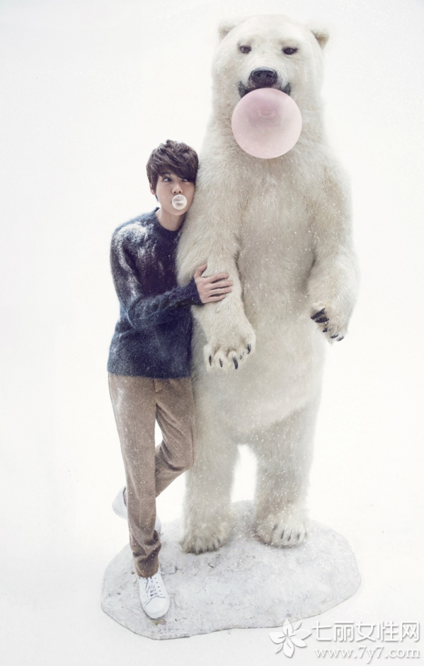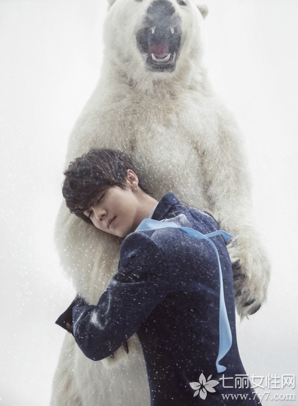 鹿晗也是22年来首次以单人写真登上时尚comos正刊封面的华人,再一次刷新了他的个人记录。本次为comos拍摄的12月正刊写真,与北极熊亲密互动,上演了一幕冬季温暖逗趣的愉悦场景,也与呼吁保护动物的主题呼应到位。鹿晗身着花织背心,搭配清新绿色衬衫,看起来极具学院风格,领口佩戴红色花样领结,清新又帅气,板栗色蓬松短发修饰出白皙脸庞,显得格外秀气迷人。