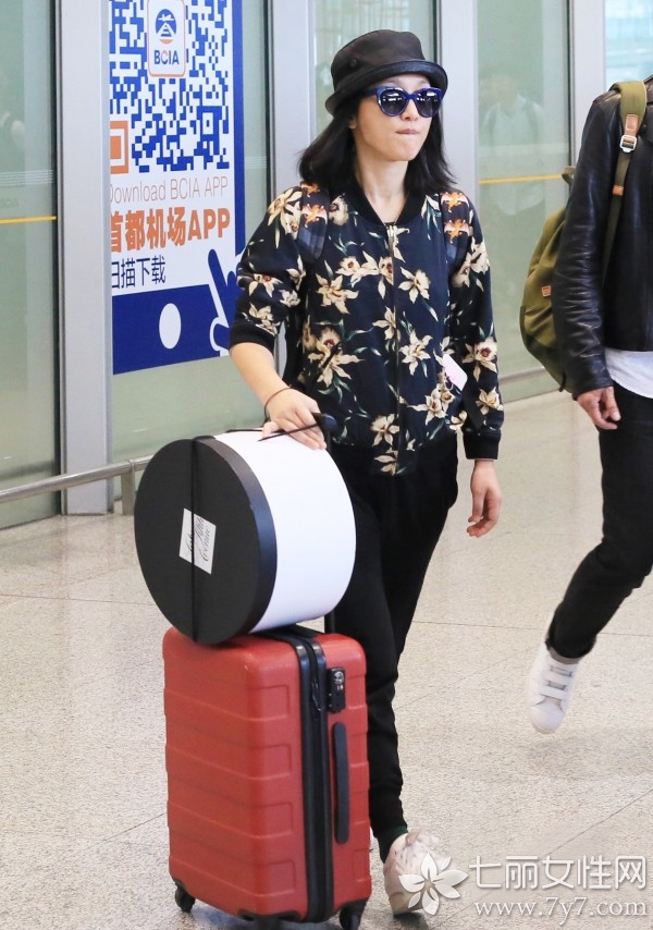 机场街拍照就要帅气多了,印花棒球外套配上运动休闲裤,显得整洁而干练,搭配黑色宽檐帽,颇有音乐青年的架势。