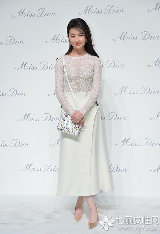刘亦菲身穿裸粉色蕾丝上衣,亮相Miss Dior展览,配上俏皮个性的印花挎包,显得清新又甜美。