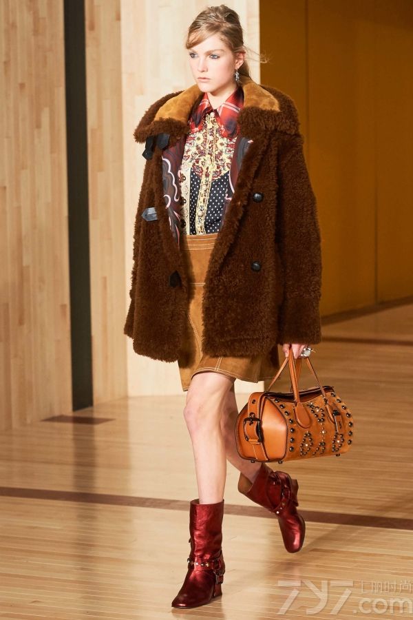 何穗最新街拍,灰色毛衣+墨绿色光泽感半裙,文艺慵懒,少女感十足。马海毛毛衣来自H&M,手提包和粉色毛拖鞋均来自Gucci,半裙来自Tibi 2016
