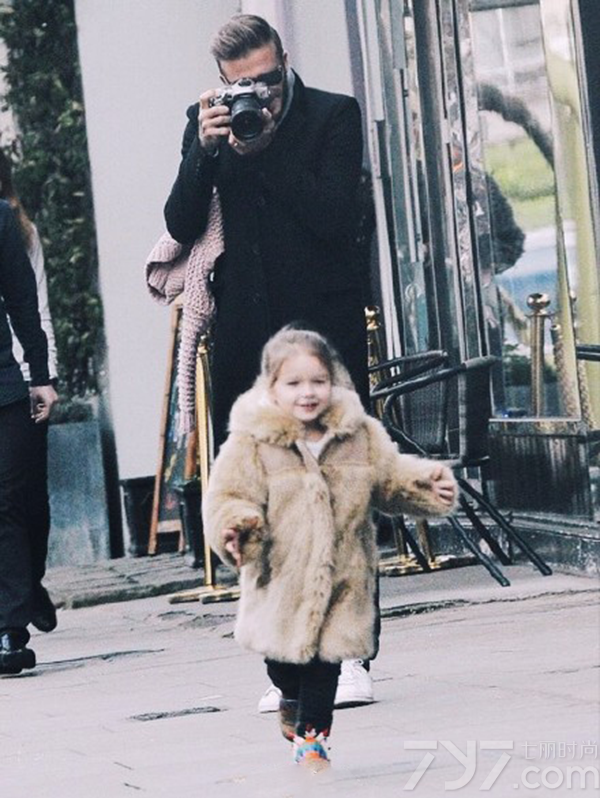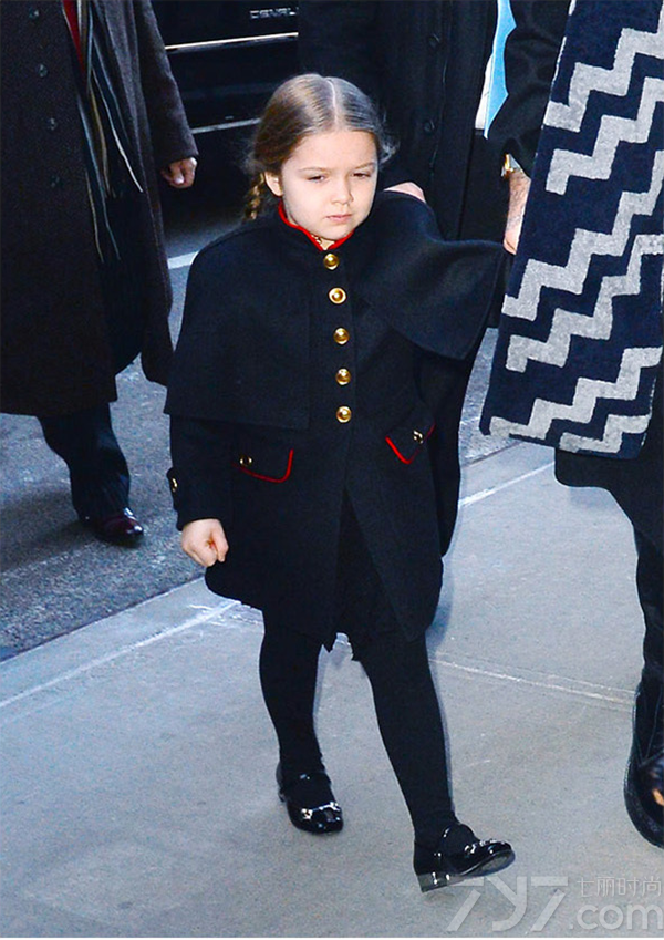 依旧是buberry斗篷,不,准确的说是军装斗篷大衣。除了衣服的滚边和扣子,all in black。小小年纪穿着就赶上了她妈,恩,臭脸也是。不过颜值高就是任性,和爸爸在一起的小七,即便一张臭脸也怎么拍怎么好看。这款也是有成人款的,请官网购买么么哒。