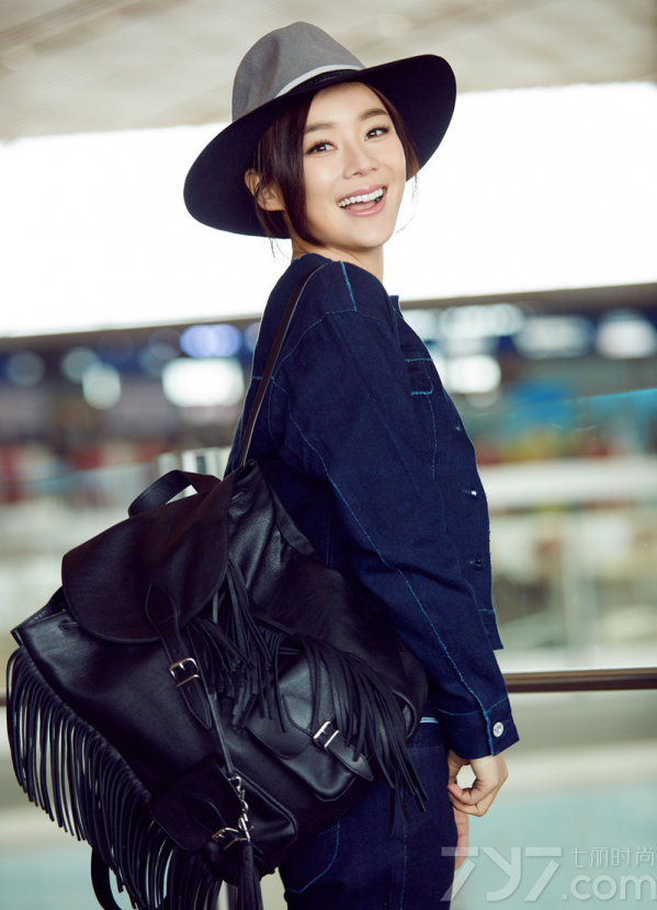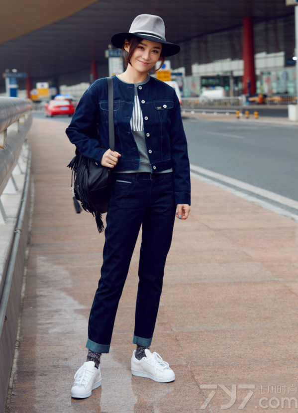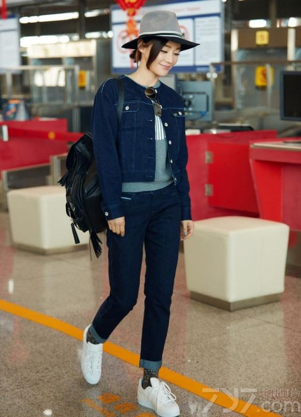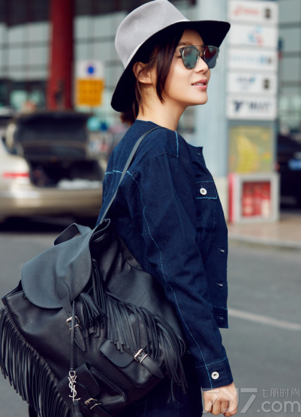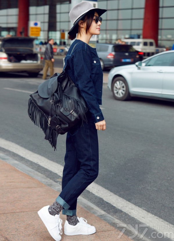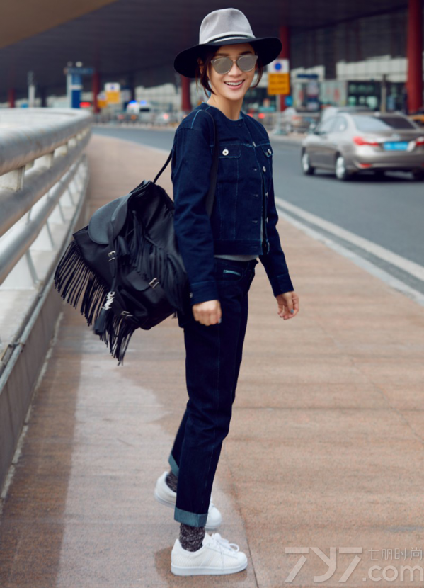 这次受邀2016伦敦时装周,袁姗姗现身机场,以一身深色牛仔装作为出发造型,搭配上绅士风十足的宽檐帽,显得个性又帅气;脚上则踩着一双小白鞋,为整体更增添了几分清爽活力,黑色流苏双肩包则与墨镜呼应,多了几分俏皮和时尚感。