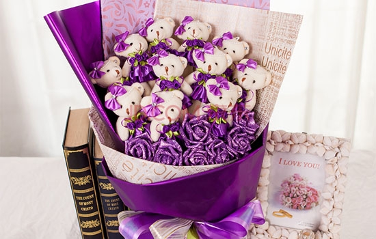 玫瑰花是情人节必不可少的礼物,作为爱情与美的象征,多色的玫瑰凭借着各自不同的花语,赢得了恋人的青睐,也为情人节这一特殊的日子增添了一抹浪漫的色彩。玫瑰的主题虽然不可偏离,但形式却变得越发千姿百态起来。现下流行的卡通花束甚至招女孩喜欢,既浪漫又可爱!这样的卡通花束想让她不喜欢都难!