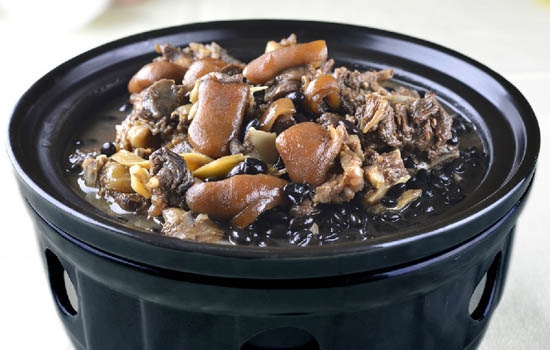 取黑豆50克、狗肉300克,将黑豆与狗肉洗净后同放锅内,加清水、葱、姜、蒜、胡椒各适量,烧开后改为文火煮烂,加盐少许,即可食用。