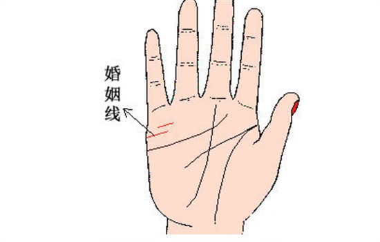 婚姻线又名爱情线、结合线,是观察结婚对象好坏或者结婚后是否幸福的部位,在水星丘侧(小指根部掌边),感情线上方,所刻划的短短横线,有时出现几条,但以最长最明显的一条为准。