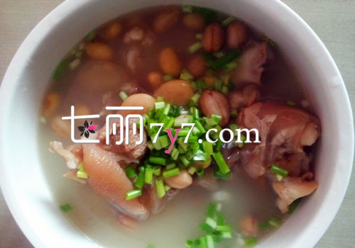 做法:将猪蹄除去蹄甲和毛后,洗净,和花生一起放入炖锅中,加水适量,小火炖熟,加食盐、味精调味即可食用。