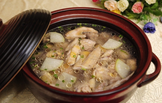 嫩鸡1只,洗剖干净,加水煮,食时在鸡汤内加进调味品(胡椒、生姜、葱花),或用来下面条吃。可减轻感冒时鼻塞、流涕症状,并能增强人体抵抗力。