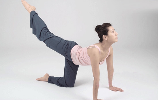 做法:趴在床上用手臂撑起上半身,下半身跪在床上,勾起脚掌;调整呼吸,吸气时将左腿向后伸展抬高,呼气的时候收回,来回做10次,然后换右腿。