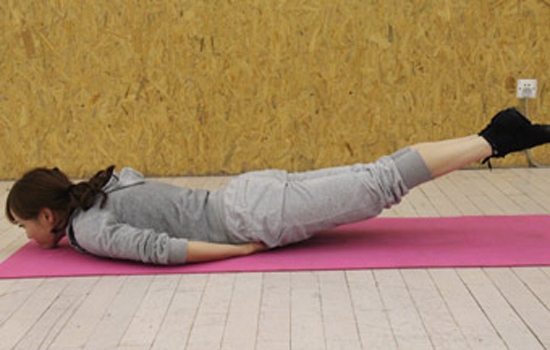 做法:身体趴在床上,双手交叉,放在下巴下面,双脚打开;深吸一口气,臀部、腰部和腹部用力,两脚向上举高,保持10秒不动;再慢慢吐气,同时将双脚放下。重复动作10次。