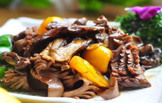 3、猪腰熟透变色时,加黄花菜50克及盐、糖适量,煸炒片刻,加水、生粉勾芡,加味精即成。