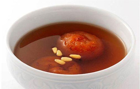 3.过滤出汤汁,放入冰箱中冷藏,食用时加入柿干丁及松子即可。