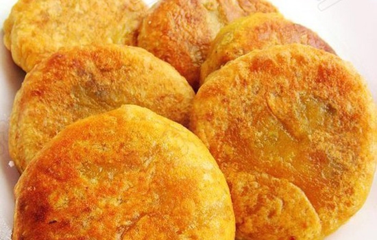 5.火上放一平底煎锅,放适量的油,小火加热,将做好的柿子饼放入,小火煎至两面金黄即可。(煎好的柿子饼最好用厨房纸吸去多余的油份,这样吃更健康。)
