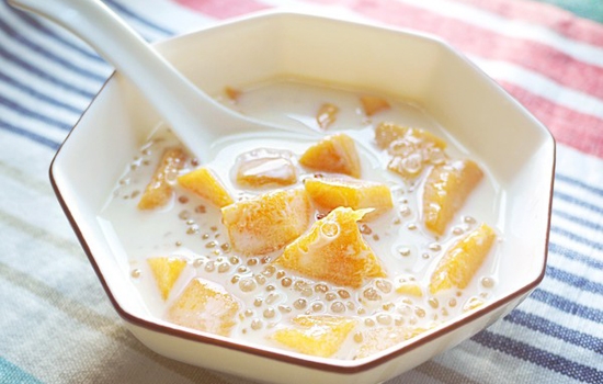 5、在容器最底层铺好西米,冰块芒果泥、芒果块,最后倒入放凉的椰浆就OK了。
