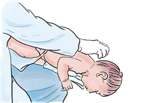 2.宝宝面朝外坐在大人腿上,大人抱着宝宝,握拳置于肚脐上,向内、向上快速用力,促使其排除。