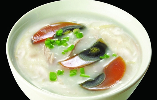 材料:粥蚝豉100克,皮蛋2个,盐渍瘦猪肉100克,大米适量