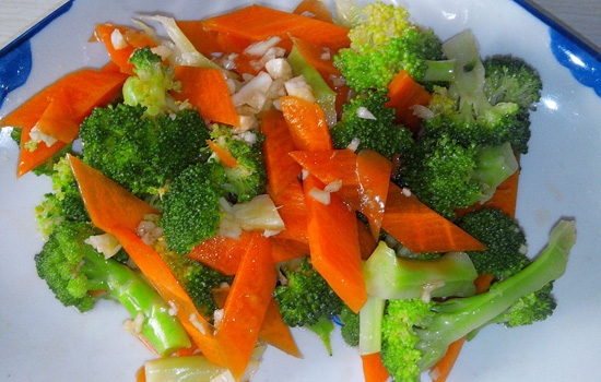 材料:西兰花、胡萝卜、鸡精、盐、花椒。