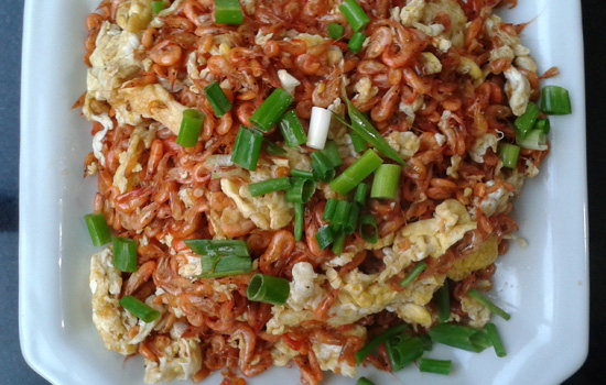 材料:蛋白3只,虾米1茶匙5g,西式火腿1片约10g,蒜2瓣,香葱花1茶匙5g,盐3g,油2茶匙10ml。