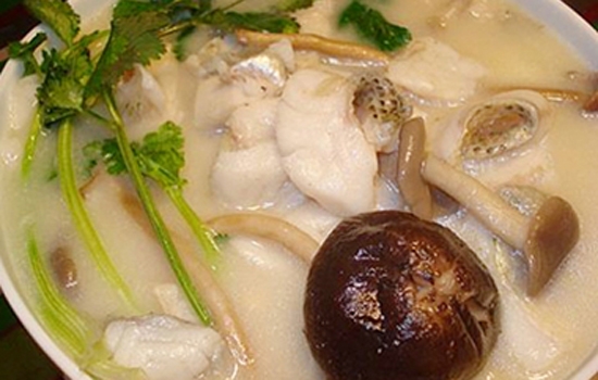 2.锅热后加少量色拉油,投入鲈鱼头尾和骨头稍微煎一下,然后下料酒,豆浆,大滚后改小火炖10分钟。再开大火投入各类菌菇,熟后关火。