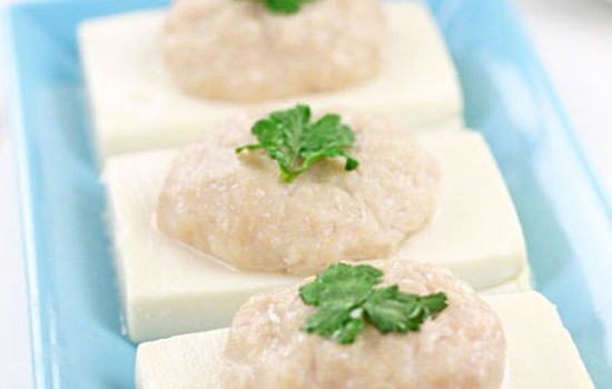 原料:鲜鱼一条、豆腐一块、淀粉、香油、葱花少许。