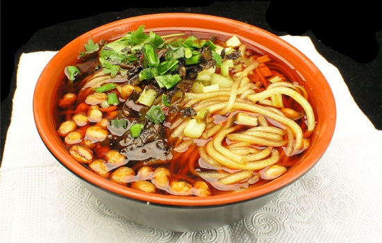 6.取一大海碗,放入1/2小勺的盐和酱油、2小勺醋,放入姜末和蒜泥,加入1大勺红油,加入大半碗的高汤,将煮熟的红薯粉放入,撒黄豆、花生、榨菜、油菜、香菜,最后撒葱末装饰。