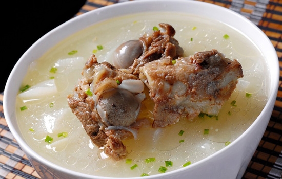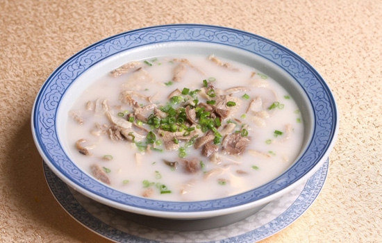 材料:羊肾100克,腰豆50克,杜仲15克,姜10克,羊骨汤1000克,盐5克,鸡精3克,糖1克,胡椒粉1克。