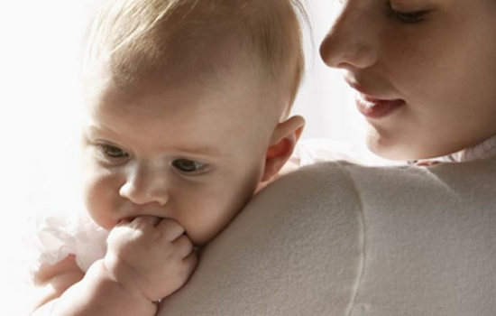 2.妈妈最好要将宝宝尽量竖立着抱在肩膀上,以手部及身体的力量将宝宝轻轻扣住,头部刚好垫在妈妈的肩膀上。